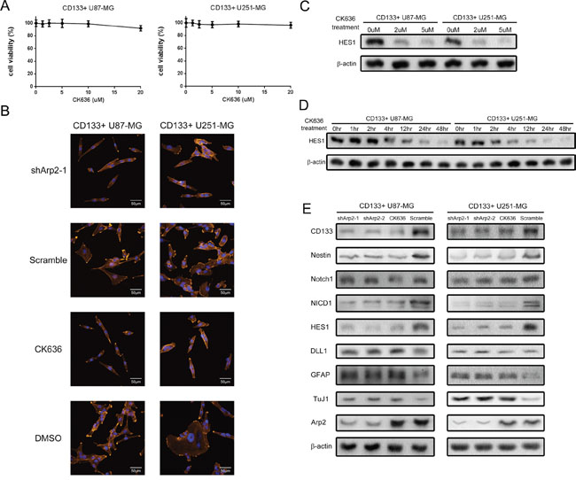 Figure 3: ArpC inhibition impaired the stemness marker expression, Notch activity, and self-renewal ability of CD133+ U87-MG and U251-MG glioma neurospheres. (A) Cells were treated by ArpC specific inhibitor CK636 for 24 hours. Cell viability was determined by Trypan Blue assay. (B) CD133+ cells were cultured in 10% serum-containing medium to induce lamellipodia. The suppression of lamellipodia formation was observed through confocal microscope after CK636 (2μM) treatment for 30 minutes (Orange: actin filaments, Blue: Nucleus). (C) HES1 expression was determined after CK636 treatment for 24 hours with different doses. (D) HES1 expression was measured after CK-636 (2μM) treatment for different periods. (E) Protein expression was detected by Western blot after shArp2 and CK636 (2μM) treatment for 24 hours.
