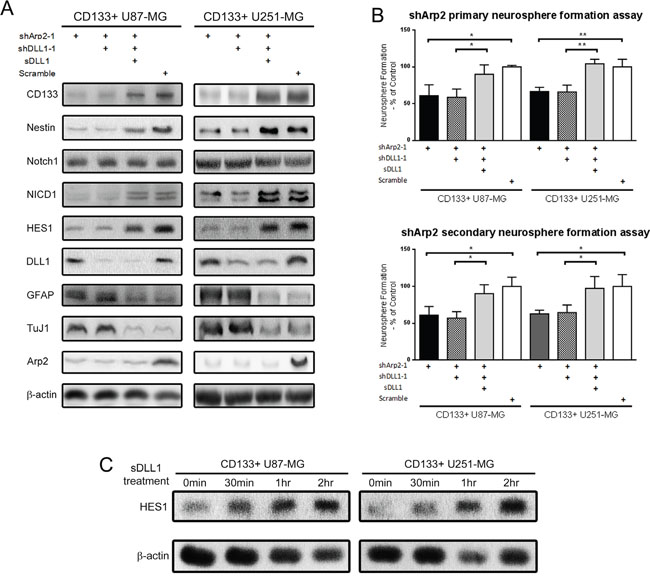 Figure 4: Soluble DLL1 instead of endogeneous DLL1 rescued the impaired stem cell phenotype induced by Arp2 silencing in CD133+ U87-MG and U251-MG cells. (A) Protein expression after shArp2, shDLL1, and soluble DLL1 treatment. (B) Primary and secondary single-cell neurosphere formation assay after shArp2, shDLL1, and soluble DLL1 treatment. (*: p<0.05, **: p<0.01) (C) Cells were treated with 5μg/ml soluble DLL1for different periods. HES1 expression was detected.