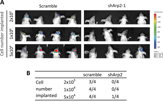 In vivo, tumorigenicity is commonly utilized to evaluate stem cell phenotype. To study the function of ArpC in tumorigenicity, we performed tumor formation titration assay in vivo. Tumorigenicity was determined through both xenograft formation incidences. ShArp2 and scramble CD133+ U87-MG neurosphere cells were implanted into the brain of the nude mice (Supplementary Figure 2). Arp2 knockdown cells exhibited fewer incidences to form xenografts than scramble cells at 42days after implantation (Figure 6A and 6B). These results elucidated that ArpC was critical for the stem cell phenotype maintenance in vivo.