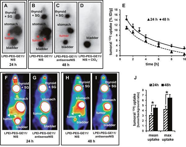 Figure 2: In vivo imaging of NIS-mediated iodide uptake. 123I scintigraphy revealed pancreatic tumoral radioiodide uptake 24 h (A) and 48 h (B) after injection of mice with LPEI-PEG-GE11/NIS that was not seen after injection with non-coding LPEI-PEG-GE11/antisenseNIS (C) Iodide uptake was perchlorate-sensitive (D) and therefore indeed NIS-mediated. (E) Radionuclide retention time in tumors was determined by serial scanning over 10 h (mean ± S.E.M.; 24 h: n=9, 48 h: n=7). 124I PET-imaging confirmed findings of scintigraphy and allowed better differentiation between tumoral and stomach radioiodide uptake (F, H) After injection of the control vector LPEI-PEG-GE11/antisenseNIS (G, I), no pancreatic iodide uptake activity above background levels could be detected. Significantly higher radioiodide accumulation 48 h after gene transfer as compared to 24 h was confirmed by PET (mean ± S.E.M.; n=5 each; *p<0.05) (J) SG: salivary glands.