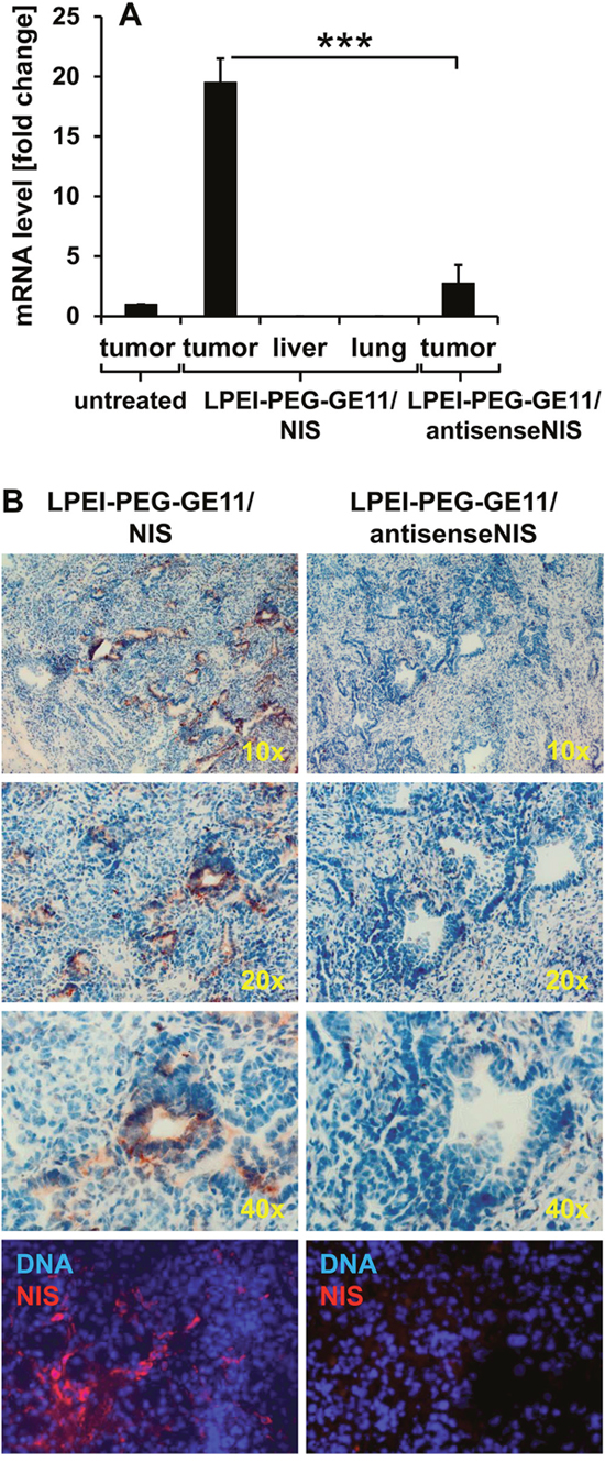 Figure 3: Analysis of NIS mRNA and protein distribution ex vivo. NIS-specific qPCR analysis revealed a 20-fold increase of NIS mRNA expression in pancreatic tumors of mice injected with LPEI-PEG-GE11/NIS as compared to tumors of untreated mice. In contrast, NIS mRNA was not increased in non-target organs and in tumors of mice injected with the control vector LPEI-PEG-GE11/antisenseNIS (mean-fold change ± S.E.M.; ***p<0.001) (A) Both immunohistochemical (B, upper three panels; magnification: 10×, 20× and 40×) and immunofluorescence staining (B, bottom panel; magnification: 200×) of sections of pancreatic tumors revealed areas of NIS-specific immunoreactivity after systemic application of LPEI-PEG-GE11/NIS. In contrast, tumors treated with the control vector LPEI-PEG-GE11/antisenseNIS showed no NIS-specific immunoreactivity.