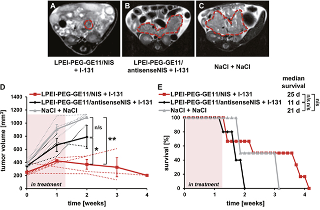 Figure 4: Therapeutic application of 131I after NIS gene transfer in vivo. Kras;p53 mice were treated with three cycles of i.v. injection of polyplexes on days 0/4/7 followed by i.p. injection of 55.5 MBq 131I 48 h later, on days 2/6/9. Tumor sizes were monitored weekly by MRI. Exemplary MRI images of endpoint tumor sizes from an LPEI-PEG-GE11/NIS + 131I- (A), an LPEI-PEG-GE11/ antisenseNIS + 131I- (B) and a NaCl + NaCl-treated Kras;p53 mouse are shown (C). Tumors are highlighted by red dotted lines. (D) Mice treated with LPEI-PEG-GE11/NIS + 131I (n=6) showed a stabilization in tumor volume compared to control groups LPEI-PEG-GE11/antisenseNIS + 131I (n=3; mean ± S.E.M.; *p<0.05) and NaCl + NaCl (n=4; **p<0.01). Mean tumor volumes (solid lines) and volumes for individual mice (dotted lines) are shown. (E) Injection of LPEI-PEG-GE11/NIS + 131I led to an increased overall and median survival in the therapy group (n=6) compared to control groups injected with LPEI-PEG-GE11/antisenseNIS + 131I (n=3; n/s) or NaCl + NaCl (n=4; n/s).