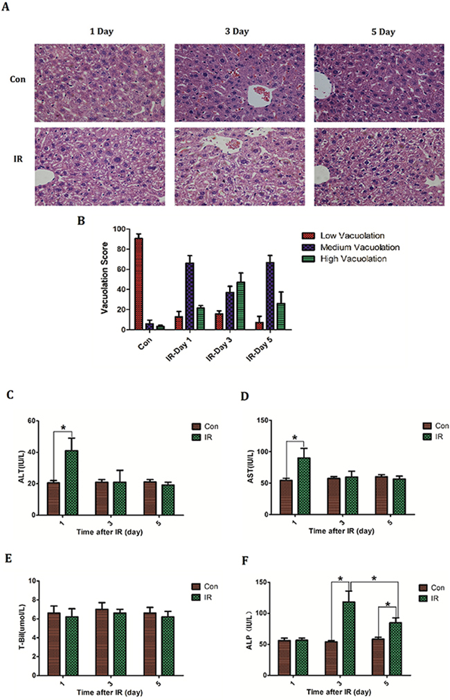 Figure 1: The establishment of acute radiation-induced liver injury model of mice. BABL/C mice received hepatic 30Gy of irradiation. On the first, third and fifth day after irradiation the livers were taken to (A, B) make histologic evaluation by H&E staining (n=5) (micrographs in A; quantified in B); Bloods were collected to measure (C) ALT level, (D) AST level, (E) T-Bil level and (F) ALP level (n=5). Magnification × 200. Data were presented as mean± SD. *P<0.05.