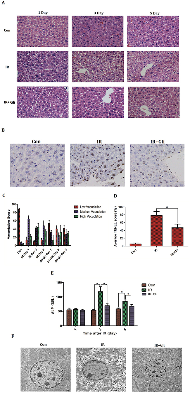 Figure 2: Glibenclamide remitted acute radiation-induced liver injury of mice. 1 hour before irradiation, BABL/C mice received intraperitoneal injection of glibenclamide (10mg/kg). On the first, third and fifth day the livers of mice (n=5) were taken to (A, C) make histopathological analysis by H&E staining (micrographs in A; quantified in C; Magnification x 200) and blood were collected to (E) measure serum ALP level. The mice livers taken on Day 3 (n=5) were detected apoptosis by (B, D) dUTP nick-end labeling (TUNEL) assay (micrographs in B; quantified in D; Magnification × 400) and (F) electron microscopic observation. Arrows represent cytopathic sites. Data were presented as mean± SD. *P<0.05.