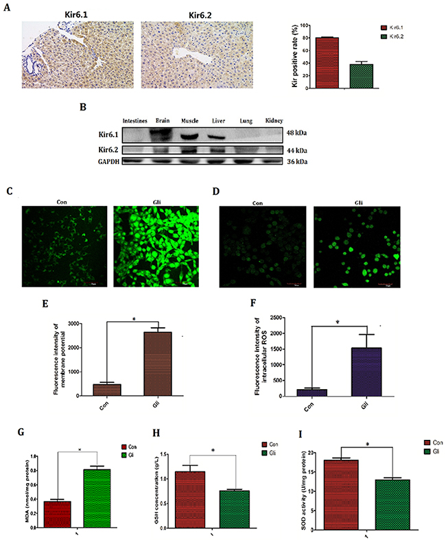 Figure 4: Glibenclamide elevated membrane potential and subsequently increased reactive oxygen species. ATP-sensitive potassium channel (KATP) is the target of glibenclamide and KATP consist of Kir6.1, Kir6.2, SUR1 and SUR2. The expression of Kir6.1 and Kir6.2 in hepatic tissue of mice (n=3) were tested by (A) immunohistochemical staining and (B) various tissues were detected by western blotting (n=3). 1 hour after treatment with glibenclamide (100μM) NCTC-1469 cells (C, E) were stained by DiBAC4(3) to test membrane potential (MP) and (D, F) were labeled by Reactive Oxygen Species Fluorogenic Probe to visualize ROS level. Simultaneously (G) the content of MDA was measured to indirectly demonstrate ROS level. (H) GSH concentration and (I) SOD activation were tested to reflect intracellular antioxidant ability. Data were presented as mean± SD. *P<0.05.