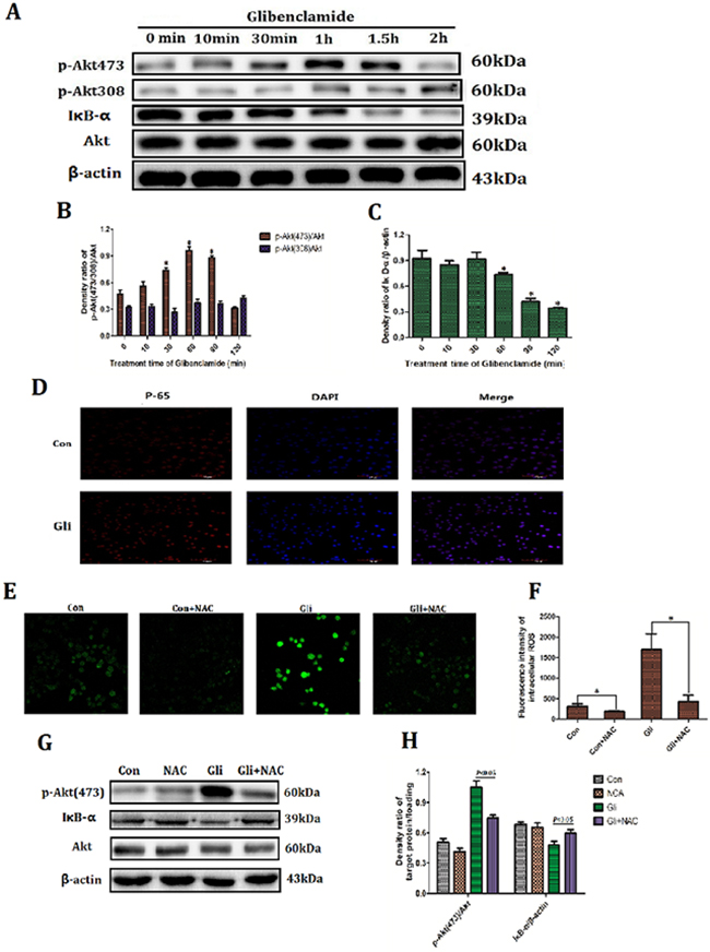 Figure 5:Glibenclamide activated Akt–NF-κB pathway via increased ROS. NCTC-1469 cells were treated with glibenclamide (100μM) and then cells were harvested at 10min, 30min, 1 hour, 1.5 hour and 2 hour to extract proteins. (A, B, C) Expression of Akt and IκB were detected by western blotting and (D) translocation of p65 into cell nucleus was manifested by immunofluorescence. 1 hour after adding NAC (500μM) (E, F) the intracellular ROS level was marked by Reactive Oxygen Species Fluorogenic Probe and was visualized with confocal microscopy. (G, H) The expressions of Akt and IκB were detected by western blotting. n=3. Data were presented as mean± SD. *P<0.05 VS control group.