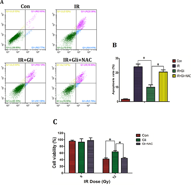 Figure 6: Elimination of ROS wiped off the protective effect of glibenclamide on irradiated NCTC-1469 cells. NCTC-1469 cells were pre-treated with glibenclamide (100μM) or glibenclamide plus NAC (500μM) for 1 hour. After been replaced medium cells received single 8Gy of irradiation. (C) 24 h later the cells viability were tested by CCK-8 assay (n=3) and (A, B) 48 h later the apoptosis rate was detected by flow cytometry (n=3). Data were presented as mean± SD. *P<0.05.