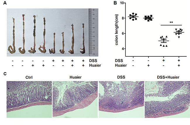 Figure 2: Huaier possesses a protective effect on mice with DSS-induced colitis. Mice were sacrificed on day 11 after colitis induction. (A) Macroscopic changes and (B) colon lengths of the mice were measured. One-way ANOVA, **p < 0.01. Data are representative of three experiments (mean and s.d. of triplicate samples). (C) Serial sections of paraffin-embedded colon tissues were stained with H&E. The original amplification was 20×. n = 8 in the control and Huaier groups; n = 8 in the DSS and DSS + Huaier groups.