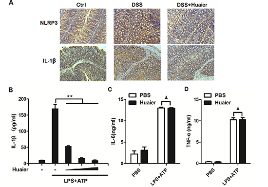 Figure 3: Huaier aqueous extract inhibits IL-1β secretion. (A) Immunohistochemistry of NLRP3 and IL-1β in colonic tissue section. Positive staining is brown. (B) Mouse peritoneal macrophages were pretreated with increasing concentration (0, 4, 8, and 16 mM) of Huaier for 2 h and then primed with LPS (100 ng/ml) for 8 h and stimulated with ATP (2 mM) for 30 min. IL-1β expression in the culture supernatants was determined by ELISA. (C) Mouse peritoneal macrophages were pretreated with PBS or Huaier (8 mM) for 2 h and then stimulated as in (B). TNF-α and IL-6 expression in the culture supernatants were determined by ELISA. Student t-test, **p < 0.01.▲, no significant differences. Data are representative of three experiments (mean and s.d. of triplicate samples).