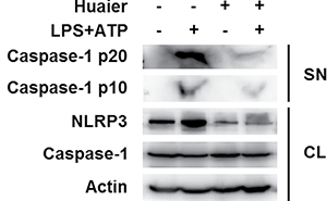 Figure 4: Huaier aqueous extract inhibits caspase-1 cleavage. Mouse peritoneal macrophages were pretreated with PBS or Huaier (8 mM) for 2 h and then primed with LPS (100 ng/ml) for 8 h and stimulated with ATP (2 mM) for 30 min. Western blot analysis was of caspase-1 p10 and p20 in the supernatants (SN) and pro-caspase-1 and NLRP3 in cell lysates (CL). Similar results were obtained in three independent experiments.