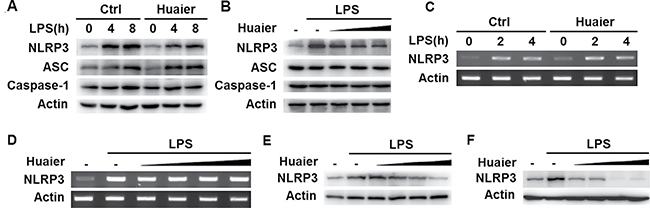 Figure 5: Huaier inhibits NLRP3 protein expression. Mouse peritoneal macrophages were pretreated with PBS or Huaier (8 mM) for 2 h and then stimulated with LPS (100 ng/ml) for indicated time periods. NLRP3 expression was detected by Western blot (A) or RT-PCR (C). Mouse peritoneal macrophages were pretreated with increasing concentration of Huaier (0, 4, 8, 16 mM for B, and 0, 2, 4, 8, 16 mM for D) for 2 h and then stimulated with LPS (100 ng/ml) for 4 h. NLRP3 expression was detected by Western blot (B) or RT-PCR (D). RAW264.7 (E) and THP-1 cells (F) were pretreated with PBS or Huaier (0, 2, 4, 8, 16 mM for E, and 0, 4, 8, 16 mM for F) for 2 h and then stimulated with LPS for 4 h. NLRP3 expression was detected by Western blot. Similar results were obtained in three independent experiments.