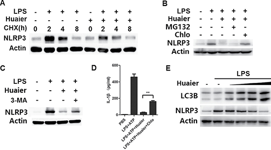 Figure 6: Huaier promotes NLRP3 degradation via promoting autophagy. (A) Mouse peritoneal macrophages were pretreated with Huaier (8 mM) for 2 h, then stimulated with LPS for 4 h, and subsequently treated for various times with cycloheximide (CHX) (10 μM). NLRP3 expression levels were detected by Western blot. (B, C) Mouse peritoneal macrophages were pretreated with Huaier (8 mM) for 2 h and then stimulated with LPS (100 ng/ml) for 8 h. The cells were treated with MG132 (10μM), chloroquine (100 μM) (B) and 3-MA (10 mM)(C) for the last 4 h. NLRP3 expression was detected by Western blot. (D) Mouse peritoneal macrophages were pretreated with Huaier (8 mM) for 2 h, primed with LPS (100 ng/ml) for 4 h, treated with chloroquine (100 μM) and finally stimulated with ATP (2 mM) for 30 min. IL-1β expression in the culture supernatants was determined by ELISA. (E) Mouse peritoneal macrophages were pretreated with increasing concentration of Huaier (0, 2, 4, 8, and 16 mM) for 2 h and then stimulated with LPS (100 ng/ml) for 8 h. LC3B and NLRP3 were detected by Western blot. Similar results were obtained in three independent experiments.