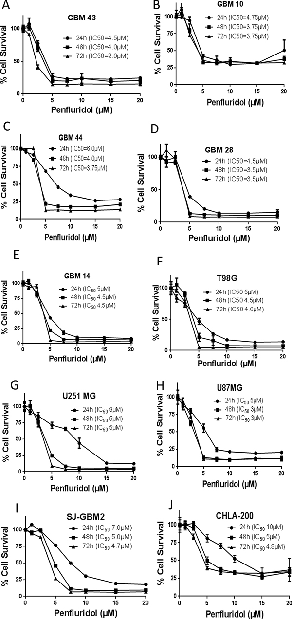 Figure 1: Penfluridol suppresses survival of glioblastoma cells. (A) GBM43 (B) GBM10 (C) GBM44 (D) GBM28 (E) GBM14 (F) T98G (G) U251MG (H) U87MG (I) SJ-GBM2 and (J) CHLA-200 glioblastoma cells were treated with different concentrations of penfluridol for 24, 48 and 72 hours. Cell survival was measured by sulforhodamine B assay to estimate IC50 values. The experiments were repeated three times with 4–8 replicates in each experiment.