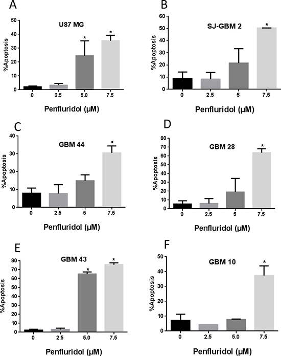 Figure 2: Penfluridol induce apoptosis in glioblastoma cells. (A–F) Approximately 0.2–0.3 × 106 U87MG, SJ-GBM2, GBM44, GBM28, GBM43 and GBM10 cells were plated in 6 well plates, treated with 2.5, 5.0 and 7.5 μM penfluridol for 48 h and processed for AnnexinV/FITC apoptosis assay using Accuri C6 flow cytometer. Values were plotted as means ± SD. Experiment was repeated three times. *Statistically significant at p < 0.05 when compared with control.