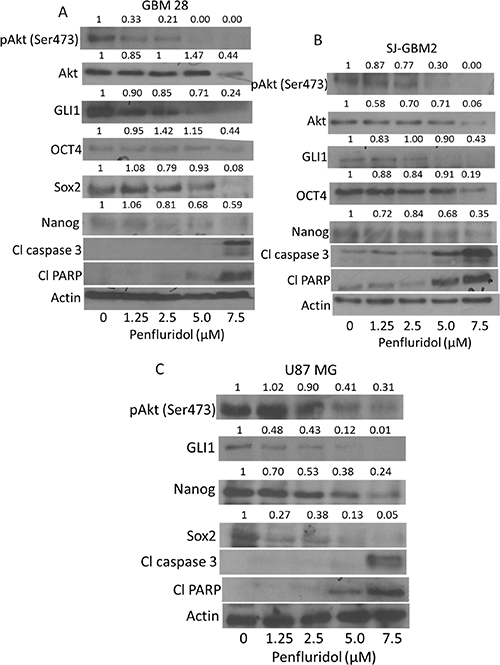 Figure 3: Penfluridol inhibits Akt-GLI1 signaling. (A) GBM28, (B) SJ-GBM2, (C) U87MG cells were treated with different concentrations of penfluridol for 48 h. Representative blots showing concentration-dependent effect of penfluridol on pAkt(Ser473), Akt, GLI1, OCT4, Nanog, Sox2, Cl caspase 3 and Cl PARP. Actin was used as loading control. Figures shown are the representative blot of at least three independent experiments.