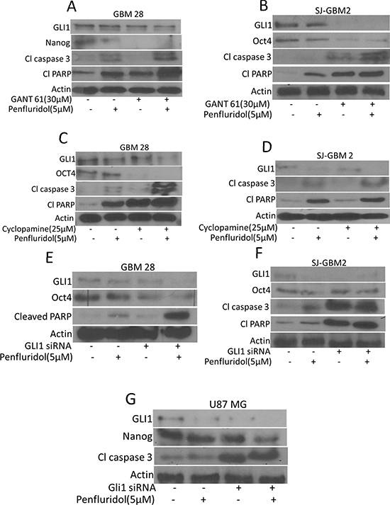 Figure 5: GLI1 mediated suppression of glioblastoma cell growth by penfluridol treatment. GBM28 and SJ-GBM2 cells were treated with penfluridol (5 μM) for 48 h after (A–B) cells were pretreated with 30 μM GANT61 for 3 h (C–D) cells were pretreated with 25 μM Cyclopamine for 3 h (E–G) GBM28, SJ-GBM2 and U87MG cells were transfected with GLI1 siRNA. Actin was used as a loading control. Figures shown are the representatives blots of three independent experiments.