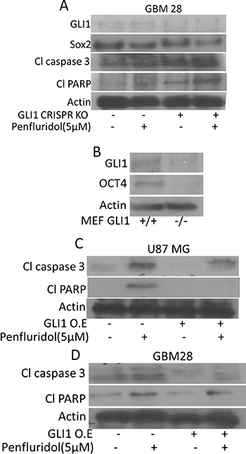 Figure 6: GLI1 mediated suppression of glioblastoma cell growth by penfluridol treatment. (A) GBM 28 cells were transfected with GLI1 CRISPR/Cas9 KO (B) Levels of OCT4 were evaluated in GLI1 (+/+) as well as GLI 1(−/−) MEFs (Mouse embryonic fibroblasts). (C–D) U87MG and GBM 28 cells were transfected with GLI1 overexpressing plasmid. Levels of Cl caspase 3 and Cl PARP were evaluated by western blotting. Actin was used as a loading control. Figures shown are the representatives blots of three independent experiments.