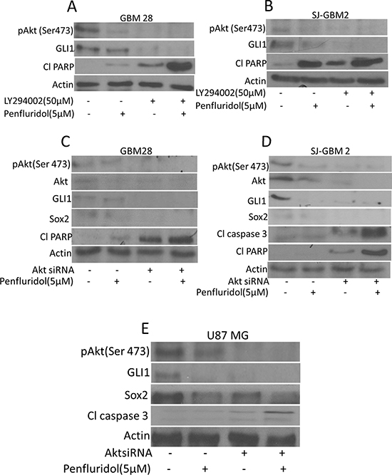 Figure 7: Akt mediated suppression of GLI1 by penfluridol treatment in glioblastoma cells. GBM28, SJ-GBM2 and U87MG cells were treated with penfluridol (5 μM) for 48 h after (A–B) GBM28 and SJ-GBM2 cells were pretreated with 50 μM LY294002 (C–E) GBM28, U87MG and SJ-GBM2 cells were transfected with AktsiRNA. Levels of pAkt(Ser 473), GLI1, Sox2, Cl caspase3 as well as Cl PARP were evaluated by western blotting.