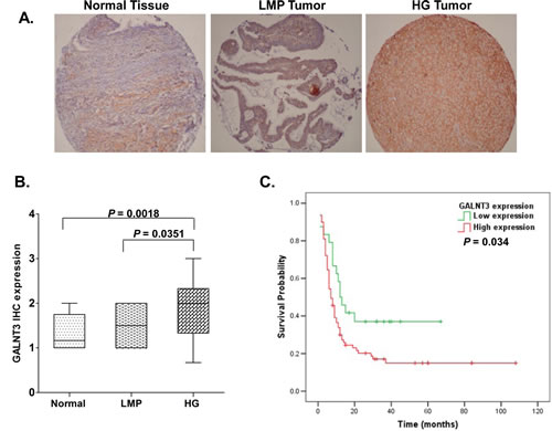 Figure 1: Analysis of GALNT3 expression in serous EOC tumors by IHC: correlation with PFS. A. Representative IHC images of GALNT3 protein expression in normal ovarian tissues, low-malignant potential (LMP) tumors and high-grade (HG) tumors. B. Box-plot presentation of GALNT3 protein expression levels in normal ovarian tissues, LMP tumors and HG tumors. C. Kaplan-Meier curves for PFS according to the level of GALNT3 IHC intensity in tumor samples of 103 serous EOC patients with advanced disease.