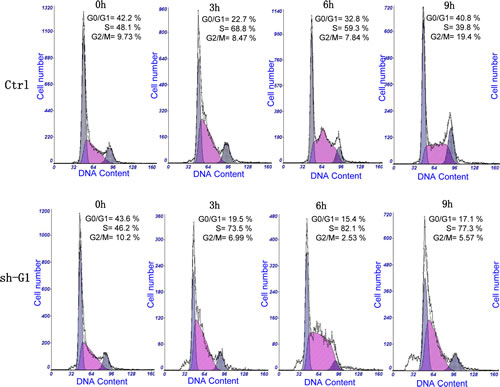 Figure 3: Effect of shRNA-mediated GALNT3 on cell cycle control in A2780s cells. Cell-cycle profile was examined by flow cytometry and percentages of cells in G0/G1, S, and G2/M phase in the shRNA-GALNT3 clone 1 (sh-G1) were compared to the mock-transfected control (ctrl) clone. Propidium iodide staining shows an increased fraction of cells in the S-phase and corresponding decrease of cells in both G1- and G2/M-phase at 6 and 9 h after removing hydroxyurea in the shRNA-GALNT3 clone G1 (sh-G1), when compared with the control clone (ctrl).