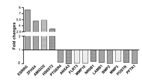 ARSJ, PLA2G4A, TIPARP, DNAJC12, MEOX1, SMA5, TLL1, BCAT1, HS6ST2 LOXL3, PDZRN3, TRIM7, RNF128 |