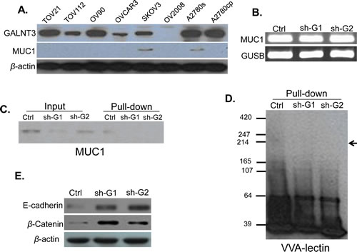 Western blot analysis was performed as previously described [69-71]. Briefly, protein lysates were prepared by resuspending cell pellets in Laemmli sample buffer containing 5% β-mercaptoethanol. Protein lysates were separated by 6 to 12% Tris-glycine gel electrophoresis and transferred onto a polyvinylidene difluoride membrane using a semidry apparatus (Bio-Rad Laboratories, Hercules, CA). The membrane was blocked with 5% nonfat dry milk in TBST (20 mmol/L Tris-HCl, 0.5 M NaCl, and 0.1% Tween 20), incubated with the anti-GALNT3 mouse monoclonal antibody (1:500) (Abgent, Inc.), anti-MUC1 mouse monoclonal antibody (1:500) (Santa Cruz Biotechnology), 0.5 μg/mL of biotin-conjugated VVA lectin (EY Laboratories), anti-E-cadherin rabbit polyclonal antibody (1:500) (Santa Cruz Biotechnology), anti-β-catenin mouse monoclonal antibody (1:500) (Santa Cruz Biotechnology), or anti-β-actin antibody (1:5000) (Santa Cruz Biotechnology), at 4oC overnight. After 3 x 15 min washes with TBST (20 mmol/L Tris-HCl, 0.5 M NaCl, and 0.1% Tween 20) at room temperature, the membrane was incubated with horseradish peroxidase-conjugated goat anti-mouse IgG (Santa Cruz Biotechnology) or 100 ng/ml streptavidin–horseradish peroxidase (Invitrogen) in TBST containing 5% non-fat dry milk for 1-2 h at room temperature. Upon washing, the signal was visualized using ECL solution (Thermo Fisher Scientific, Waltham, MA) and detected on blue sensitive autoradiography film (Marsh Bio Products, Rochester, NY).