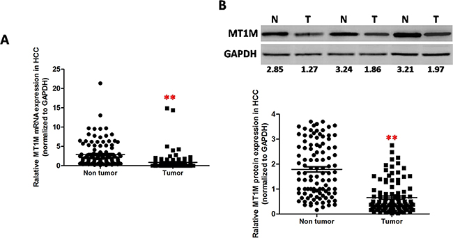 Figure 1: MT1M was downregulated in HCC tumor tissues. (A) Downregulated expression of MT1M in HCC tumor tissues (T) compared with adjacent non-tumor tissues (N) (n = 118,*p < 0.01, **p < 0.001) by quantitative RT-PCR. (B) Downregulated expression of MT1M in HCC tumor tissues (T) compared with adjacent non-tumor tissues (N) by Western blot. Upper panel: representative data of 3 paired HCC tissues; Lower panel: the summary data of 118 paired HCC tissues (*p < 0.01, **p < 0.001).