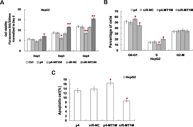 Figure 3: MT1M suppressed cell viability, cell cycle and apoptosis. (A) The effect of MT1M on cell viability. (B) The effect of MT1M on cell cycle. (C) The effect of MT1M on cell apoptosis. Representative results were from HepG2 cells transfected with p4, siR-NC, p4-MT1M or siR-MT1M respectively. Column, mean of three independent experiments; bars, SD; *p < 0.01; **p < 0.001.