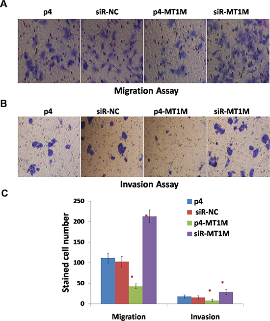Figure 4: MT1M suppressed cell migration and invasion. (A) The effect of MT1M on cell migration. (B) The effect of MT1M on cell invasion. (C) Summary of data in A&B. Representative results were from HepG2 cells transfected with p4, siR-NC, p4-MT1M or siR-MT1M respectively. Column, mean of three independent experiments; bars, SD; *p < 0.01; **p < 0.001.
