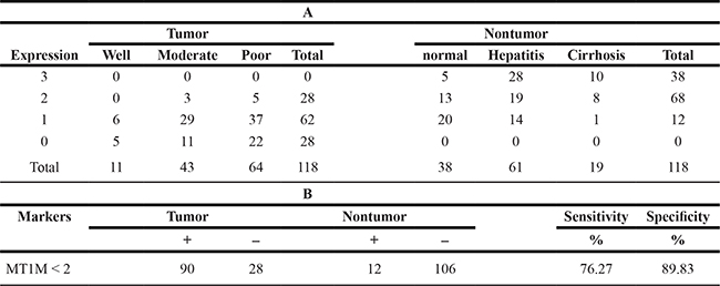 To evaluate the usefulness of MT1M for HCC diagnosis, HCC tissue arrays (Supplementary Table 2) were used. As the representative results, MT1M was strong stained in the cytoplasm of non-tumor cells, but in tumor cells, staining was weak or negative (Figure 5A). Furthermore, MT1M expression was weak or negative in most HCC tumor tissues (90 of 118 cases). However, MT1M expression was moderate or strong (score 2~3) in most non-tumor tissues (106 of 118 cases) (Figure 5B, Table 1). The sensitivity of MT1M for HCC diagnosis was 76.27% and the specificity was 89.83% (Table 1). It was indicated that MT1M might be a potential biomarker for HCC early diagnosis.