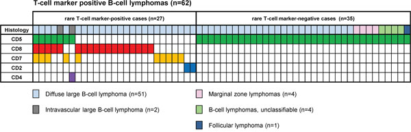 In contrast to CD5, the significance of other T-cell markers rarely expressed in B-cell lymphomas remains unclear. Although B-cell lymphomas with T-cell markers other than CD5, such as CD8+ CLL [5–13] or CD2/CD3/CD4/CD7/CD8+ large B-cell lymphoma [13–31] have been reported (Table 1), data regarding their frequency, histopathological distribution, and clinical features are rarely available, because the number of identified cases in each report is small. This rarity may partly be attributed to the differences in the immunophenotypic procedures used. In immunohistochemistry (IHC), a limited number of lineage markers, such as CD3, CD20, and/or other frequently expressed lineage markers, are usually examined first; other less frequently expressed markers are subsequently investigated for further subclassification. This convention means that once a case is determined to be of B-cell lineage, it may be further examined for other less frequently expressed B-cell markers, but not T-cell markers.