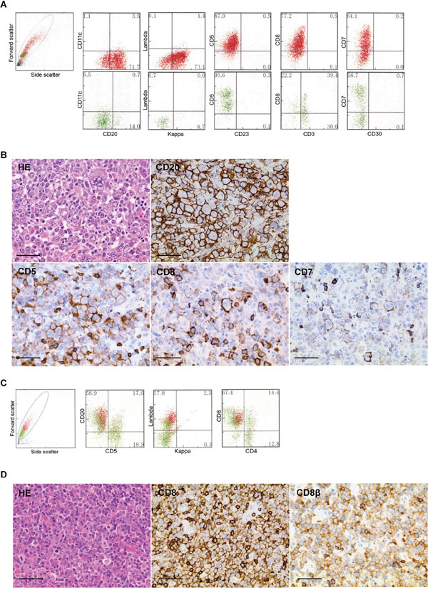 Formalin-fixed, paraffin-embedded tissue sections were used for histopathological examination. Histopathological images were photographed using an Olympus BX51 microscope equipped with an Olympus UPlan SAPO 40x objective and a JVC KY-F75 digital camera. IHC was performed using a Dako Autostainer with the EnVision+ System-DAB(Dako, Glostup, Denmark), or a BOND-III with the Bond polymer Refine Detection kit (Leica Microsystems, Melbourne, Australia), with antibodies for CD5, CD10, CD20, BCL2, BCL6, MUM1, MYC, CD2, CD7, CD4, CD8, and CD8β (Table 6). DLBCL cases were classified into GC or non-GC phenotypes, according to the Hans algorithm [42]. For cases positive for non-CD5-T-cell markers by FCM analysis, additional immunostaining of T-cell markers was performed. On IHC analysis, cells were considered positive for T-cell markers when a small population of neoplastic cells was clearly positive. The cutoffs for MYC and BCL2 IHC were ≥ 40% and ≥ 50%, respectively. The presence of EBV was assessed by in situ hybridization with EBV-encoded small RNA. Fluorescence in situ hybridization (FISH) was performed on formalin-fixed, paraffin-embedded sections using three break-apart probes: BCL2, BCL6, and MYC FISH DNA split signal probes (Dako).