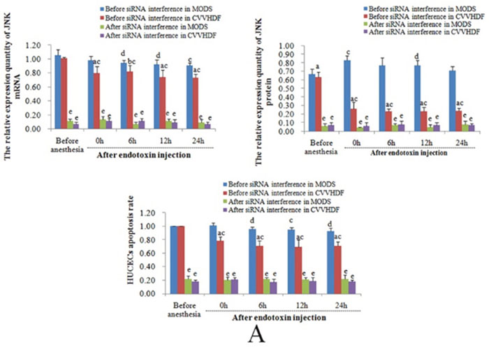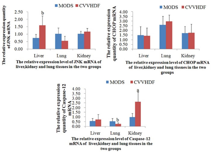 Figure 2: The mRNA relative expression of JNK, CHOP and Caspase-12 in Liver, Lung and Kidney tissues before interfered by siRNA. The immunofluorescence quantitative PCR was used to detect the expression level of JNK, CHOP and Caspase-12 mRNA in liver, lung and kidney tissues. Values were expressed as mean ± SD, (aP<0.01, bP<0.05, CVVHDF versus MODS).