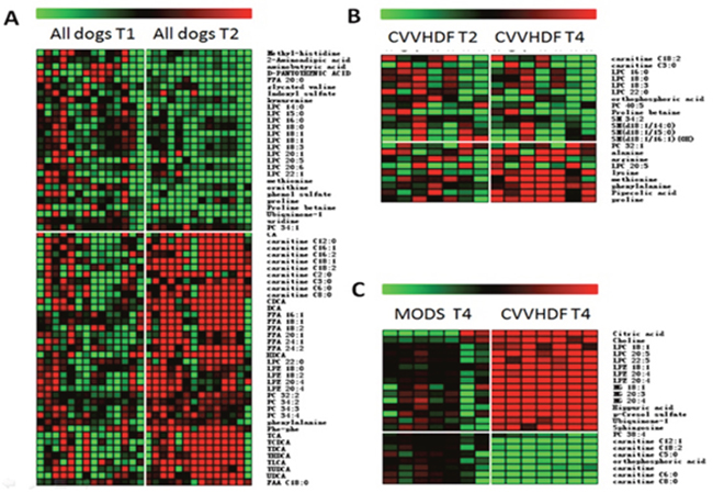 The dogs were assigned randomly to CVVHDF treatment group (n=6) and MODS group (no treatment, n=6). The dogs in CVVHDF group were given the typical CVVHDF treatment for 24h after the completion of the endotoxin intravenous infusion, while those in MODS group received the i.v heparin at the same dosage as CVVHDF group instead. Serum sample were collected at five time points, i.e. before anesthesia, 0h, 6h, 12h, 24h after the endotoxin injection (T1~T5, respectively).
