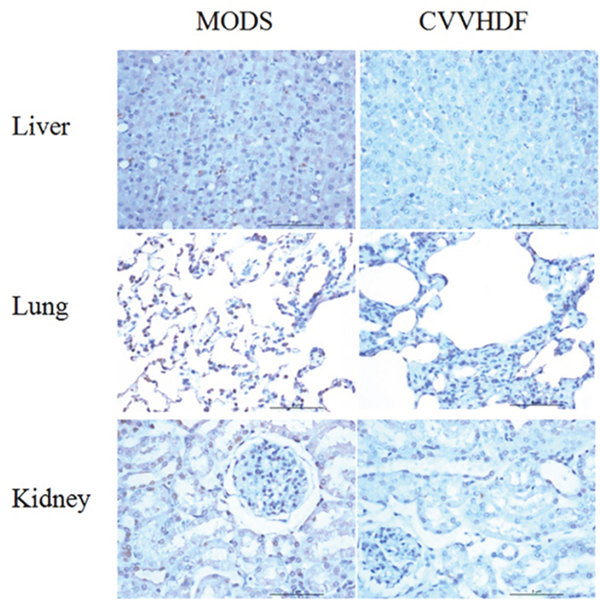 In vivo, there was no significant difference between MODS and CVVHDF group in mRNA levels only except that JNK in liver, Caspase-12 in lung and kidney, and it was indicated that there was no significant difference generally (Figure 2 and Table 2).
