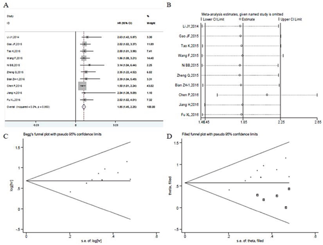 The sensitivity analysis was performed to assess the stability of the results by removing each study in turn. The result indicated that meta-analysis results didn’t not change significantly (Figure 2B), which suggesting the robustness of the results. We assess the publication bias by the Begg’s funnel plot and Egger’s test. However, the shapes of funnel plot were asymmetric (Figure 2C), and publication bias was significant by Begg’s test (z = 1.53, P = 0.125) and Egger’s test (t[bias] = 4.51, P = 0.001). Nonparametric “trim-and-fill” method was used to replace six missing studies (Figure 2D). After the trim-and-fill adjustment, the estimated pooled HR was 1.823, with 95 % CI being 1.563–2.126 (p<= 0.001).