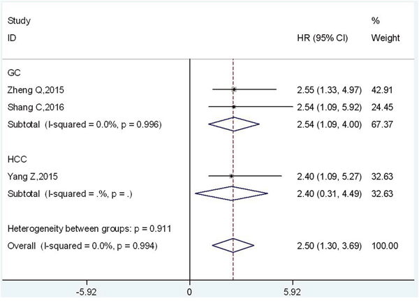Cancer is now becoming the leading cause of death in both developed and developing countries [1]. Digestive system malignant tumors occupy most of the all-cancer incidence and mortality, with 3.4 million new diagnosed cases and 1.5 million deaths each year [2]. The prognosis of patients with digestive system malignancies were unfavorable. Effective and accessible clinical biomarkers were urgently required for the prognosis prediction of patients with digestive system malignant tumors, since there was still no specific and accepted biomarker for this kind tumors.