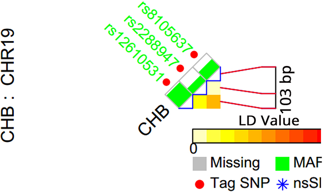 Figure 1: TagSNP selection for TINCR gene. Red point represents a TagSNP, while gray square means “missing”, and green square means MAF.