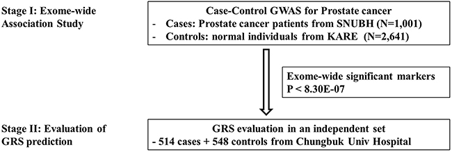 Our study was performed in a two-stage design as depicted in Figure 1. In Stage I, 1,001 PCa samples and 2,641 population controls were used to find the associated markers in the Korean population and examine the previously identified GWAS SNPs in the different ethnic populations. In Stage II, the GRS was calculated based on the validated SNPs from Stage I in order to determine its discriminative ability in an independent set of cases and controls.