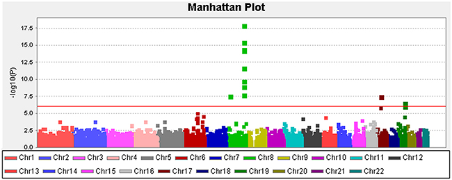 Figure 2: Manhattan plot depicting the Stage I results of the exome-wide association study. Y-axis: -log10(p-value); X-axis: genomic position. The solid red line shows the study-specific exome-wide significance level at a p-value of 8.30E-07.