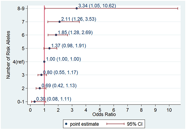 Figure 4: Odds ratio (OR) of prostate cancer according to genetic risk score (GRS) category in an independent data set consisting of 514 cases and 548 controls from the Chungbuk University Hospital. An allele dosage category of 4 was used as a reference group.