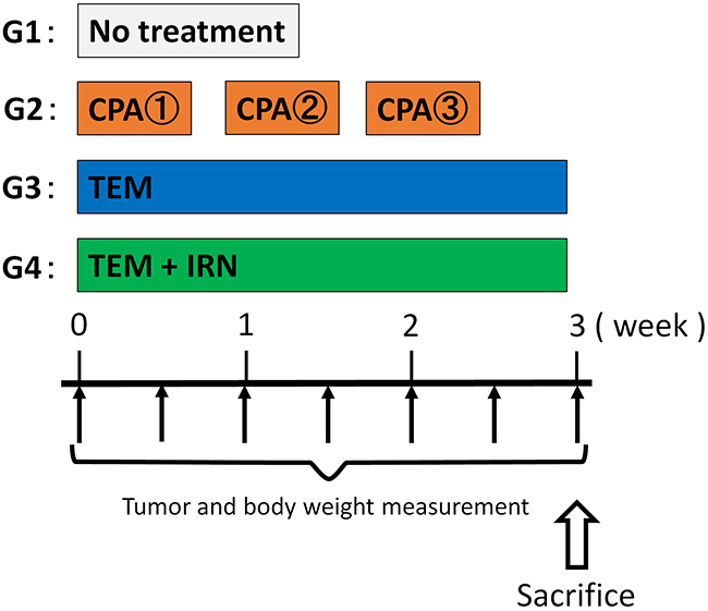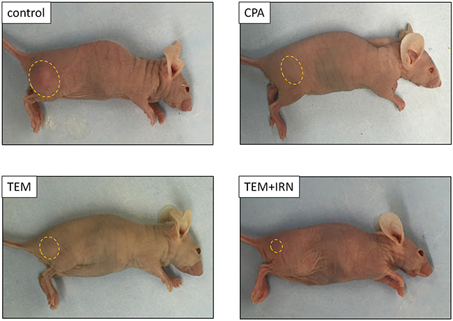 Figure 3: Efficacy of CPA, TEM and TEM combined with IRN. Photographs of representative PDOX mouse models from each treatment group at day 21.