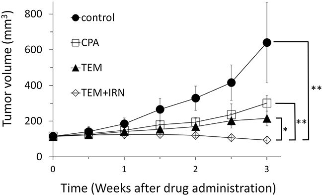 Figure 2: Efficacy of cyclophosphamide (CPA), temozolomide (TEM) and TEM combined with irinotecan (IRN). CPA (140 mg/kg, i.p., qw×3); TEM (25 mg/kg, p.o., qd×21); TEM (25 mg/kg, p.o., qd×21) combined with IRN (4 mg/kg, i.p., qd×21). Tumor volume was measured at the indicated time points after the onset of treatment. Please see the Materials and Methods for details. N = 8 mice/group. *P=0.0002; **P<0.0001.