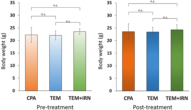 Please see Figure 1 for treatment schema. All treatments significantly inhibited the PRMS PDOX growth compared to untreated controls on day 21 after initiation. Tumor volumes at day 21 were: control (G1): 640.6 ± 225.5 mm3; CPA (G2): 301.1 ± 43.6 mm3, p=0.002; TEM (G3): 215.2 ± 40.6 mm3, p=0.0004; TEM combined with IRN (G4): 93.6 ± 8.7 mm3, p<0.0001. TEM combined with IRN showed significantly more efficacy compared to other therapies evaluated: CPA (p<0.0001), TEM (p=0.0002) (Figures 2 and 3). There were no animal deaths in any group. The body weight of treated mice was not significantly different in any group (Figure 4). No significant other side effects were observed either.