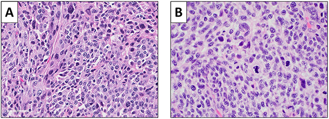 A high-power photomicrograph of the original patient tumor displayed solid sheets of tumor cells characterized by pleomorphic, hyperchromatic, enlarged nuclei with coarse chromatin and moderate amounts of lightly eosinophilic cytoplasm. Numerous mitotic figures, including atypical forms are present. A high-power image of the orthotopically-implanted tumors had very similar features, including pleomorphic, hyperchromatic, enlarged nuclei with coarse chromatin and moderate amounts of lightly eosinophilic cytoplasm. Numerous mitotic figures, including atypical forms are also present (Figure 5), demonstrating the fidelity of the PDOX tumor.