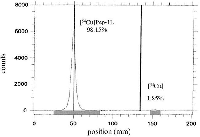 Figure 1: RadioTLC analysis of [64Cu]Pep-1L. Analysis demonstrates 98.15% radiochemical purity (5 mM EDTA solution as mobile phase on an iTLC plate).
