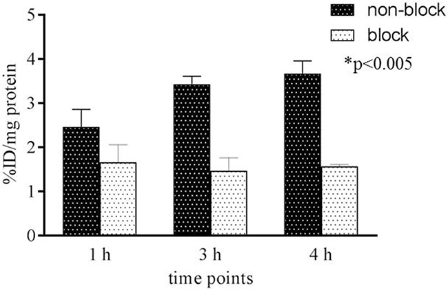 Figure 3: Cell uptake of [64Cu]Pep-1L. Uptake of [64Cu]Pep-1L in IL13RA2-expressing G48 cells after 1, 3, and 4 h of exposure. Receptor blockade experiments were performed to demonstrate specificity by exposing cells to 50x excess unlabeled peptide, 15 min prior to adding radiolabeled peptide to saturate binding sites. The data were expressed as % injected dose (ID)/mg of protein present in each well with p values ≤ .005 considered statistically significant (n=6).