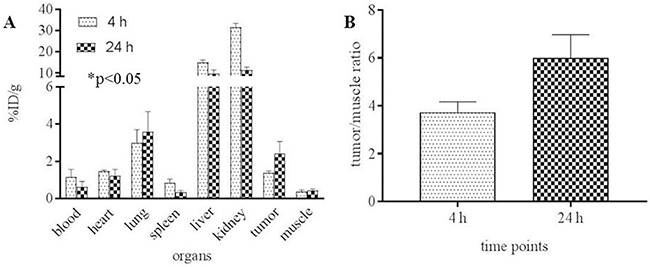 Figure 4: In vivo properties of [64Cu]Pep-1L (A) biodistribution and (B) tumor-to-muscle (target: nontarget) ratio of [64Cu]Pep-1L in mice bearing IL13RA2-expressing tumor xenografts 4h and 24h post injection (n=4) with p values ≤ .05 considered statistically significant.