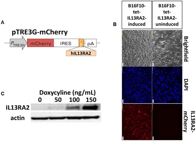 Figure 5: Characterization of inducible hIL13RA2 expressing cells. (A) Scheme of inducible hIL13RA2 expressing plasmid. The receptor sequence was cloned into the pTRE3G vector that contains a tetracycline inducible promoter (TRE3G), which drives expression of the mCherry fluorescent reporter and hIL13RA2 (B) Induced mCherry fluorescence tag visualized under a fluorescent microscope. mCherry fluorescence is seen only in doxycycline induced clone 18 B16F10 cells in vitro. Non-induced clone 18 B16F10 cells show lack of mCherry fluorescence. Doxycycline activated production of hIL13RA2 protein in B16F10 clone 18 cell line. (C) Western blotting using antibody for hIL13RA2 shows proportionally increasing levels of hIL13RA2 as concentration of doxycycline increases.