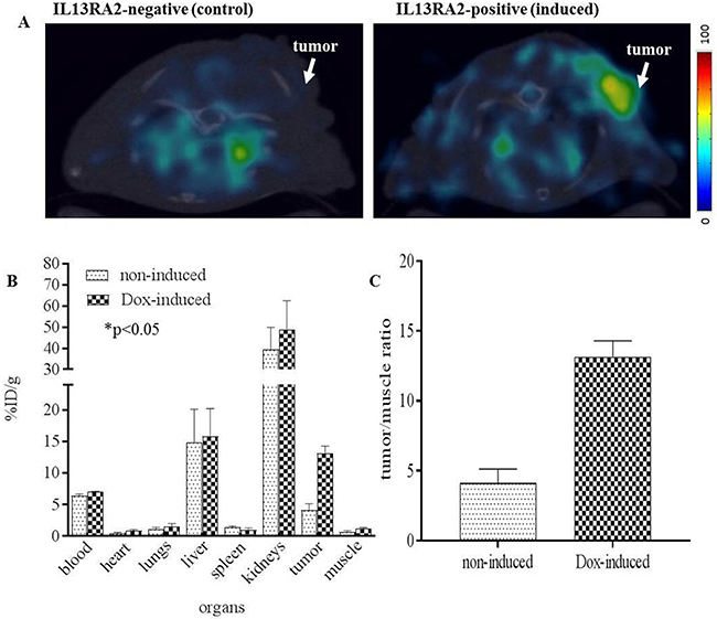 Figure 6: PET/CT of [64Cu]Pep-1L targeting IL13RA2 expressing tumors. Representative axial fused microPET/CT images obtained after injection of [64Cu]Pep-1L in a novel doxycycline inducible IL3RA2 tumor model. (A) PET/CT of IL13RA2-induced and uninduced tumor-bearing mice at 4 h post injection. (B) Post-PET biodistribution analysis shows [64Cu]Pep-1L specifically accumulates in hIL13RA2 expressing induced B16F10 tumors with absolute values in %ID/g with with p values ≤ .05 considered statistically significant (n=4) and (C) tumor/muscle ratios of [64Cu]Pep-1L accumulation in hIL13RA2-expressing B16F10 tumors compared to uninduced control tumors.